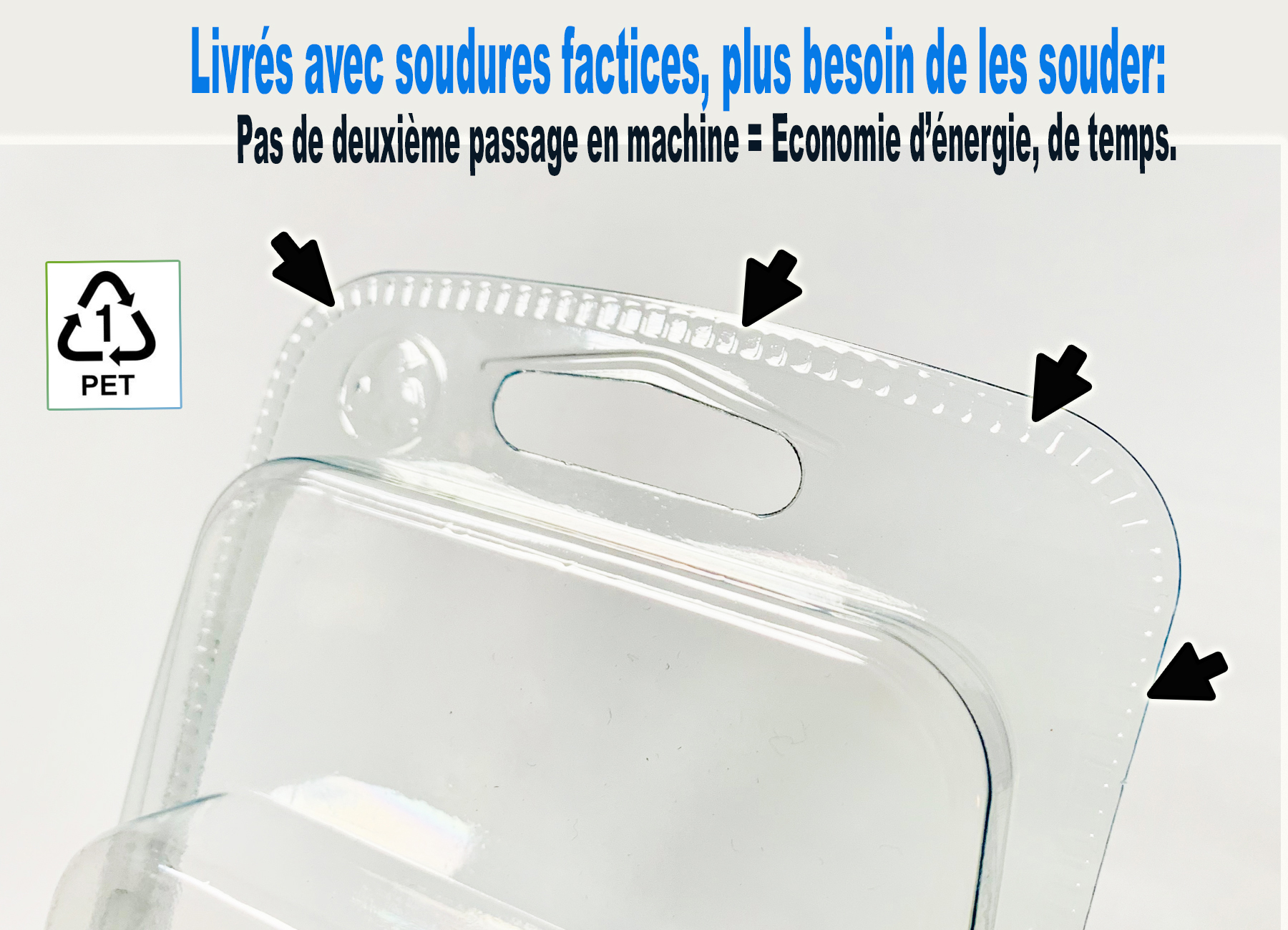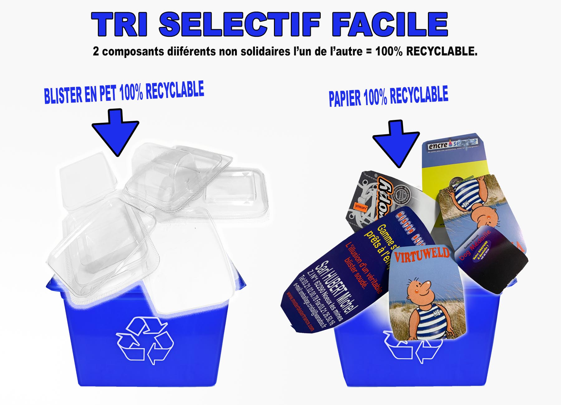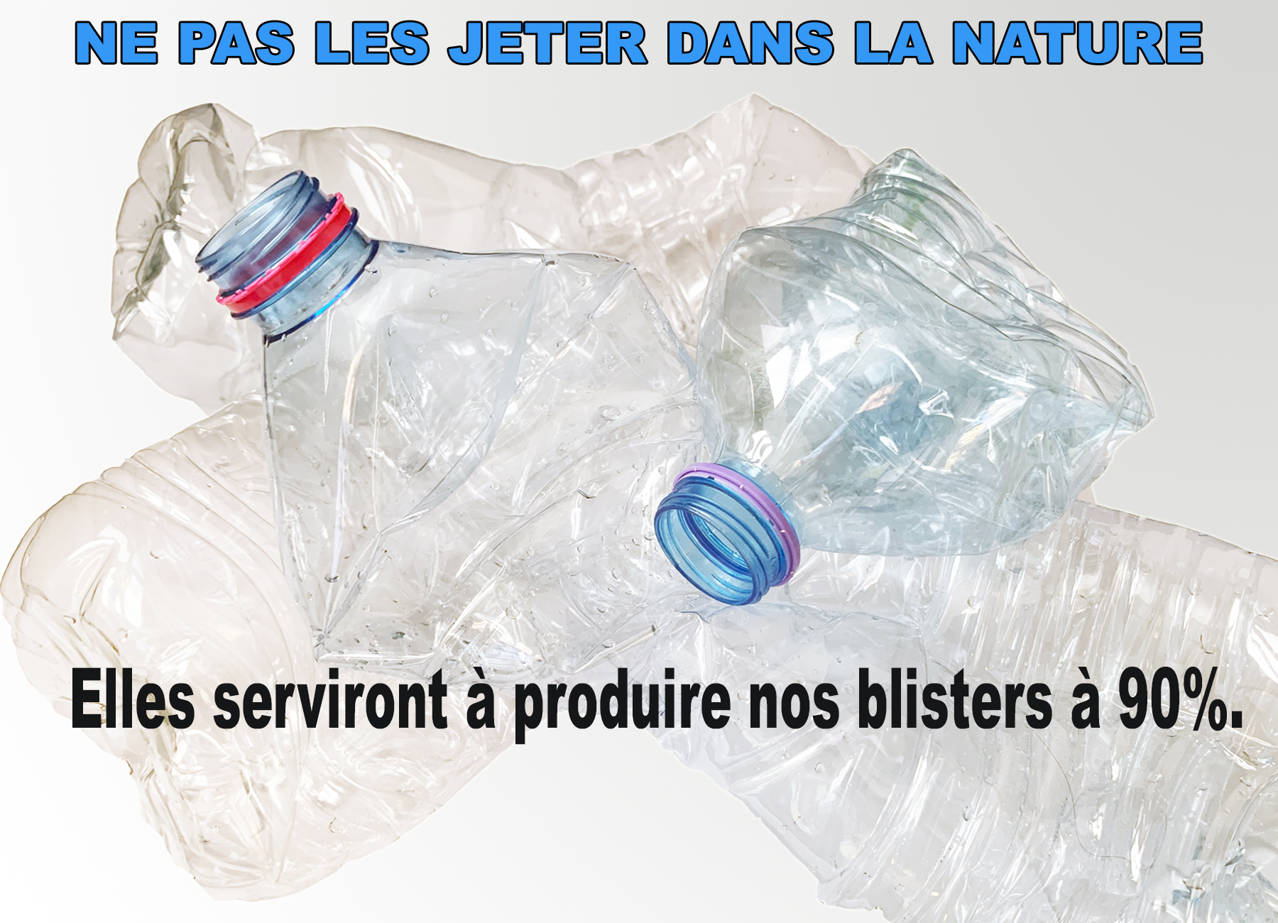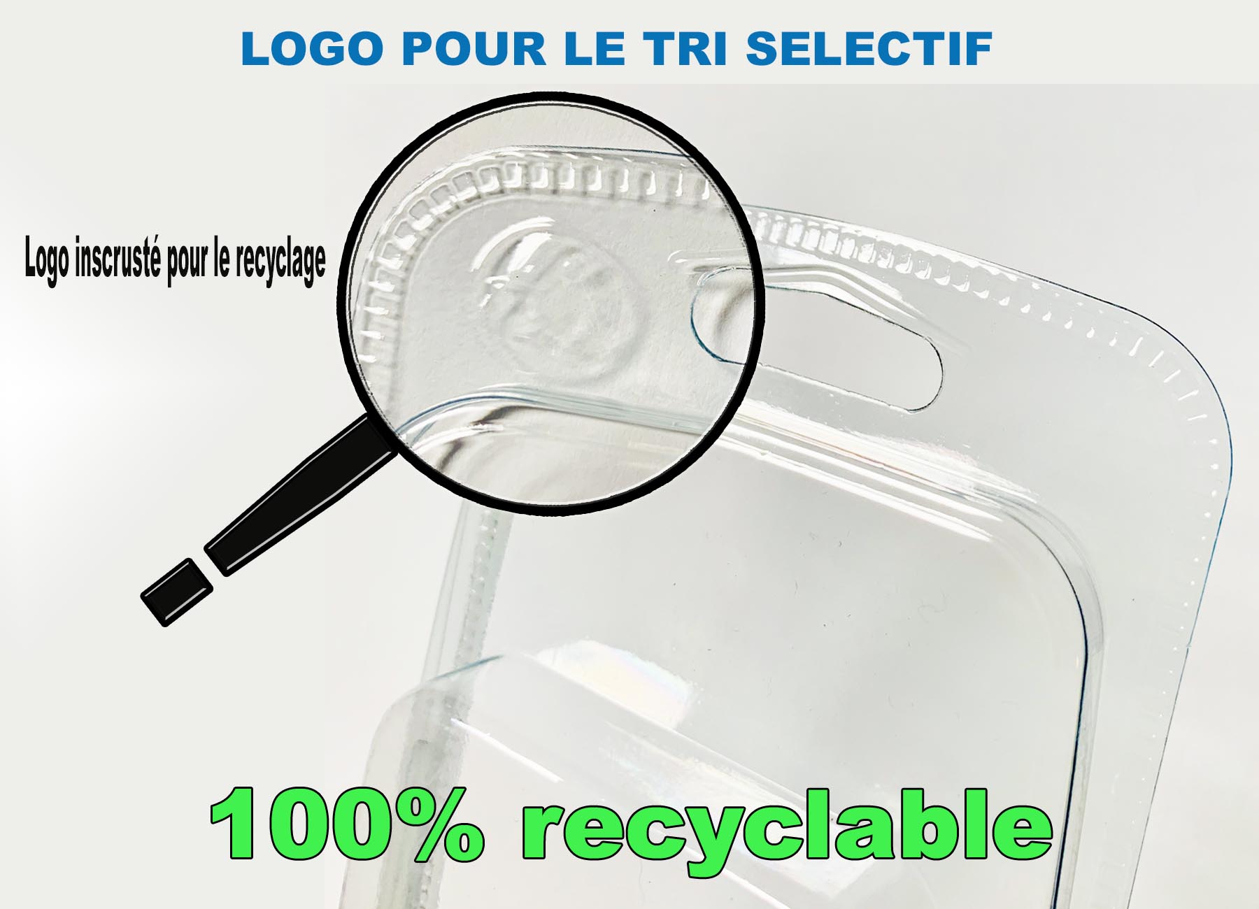 Tous nos blisters sont 100% recyclables et fabriqués en PET recyclé à 90%+ 10% PET neuf pour la transparence.